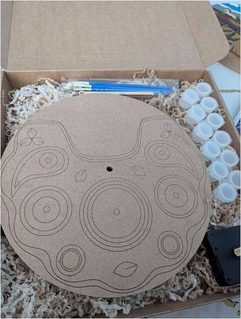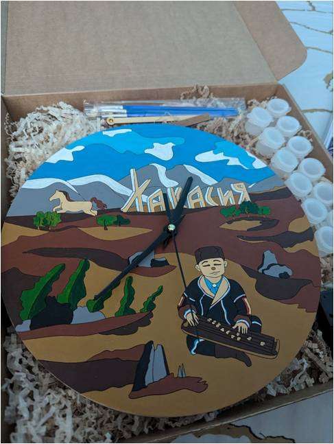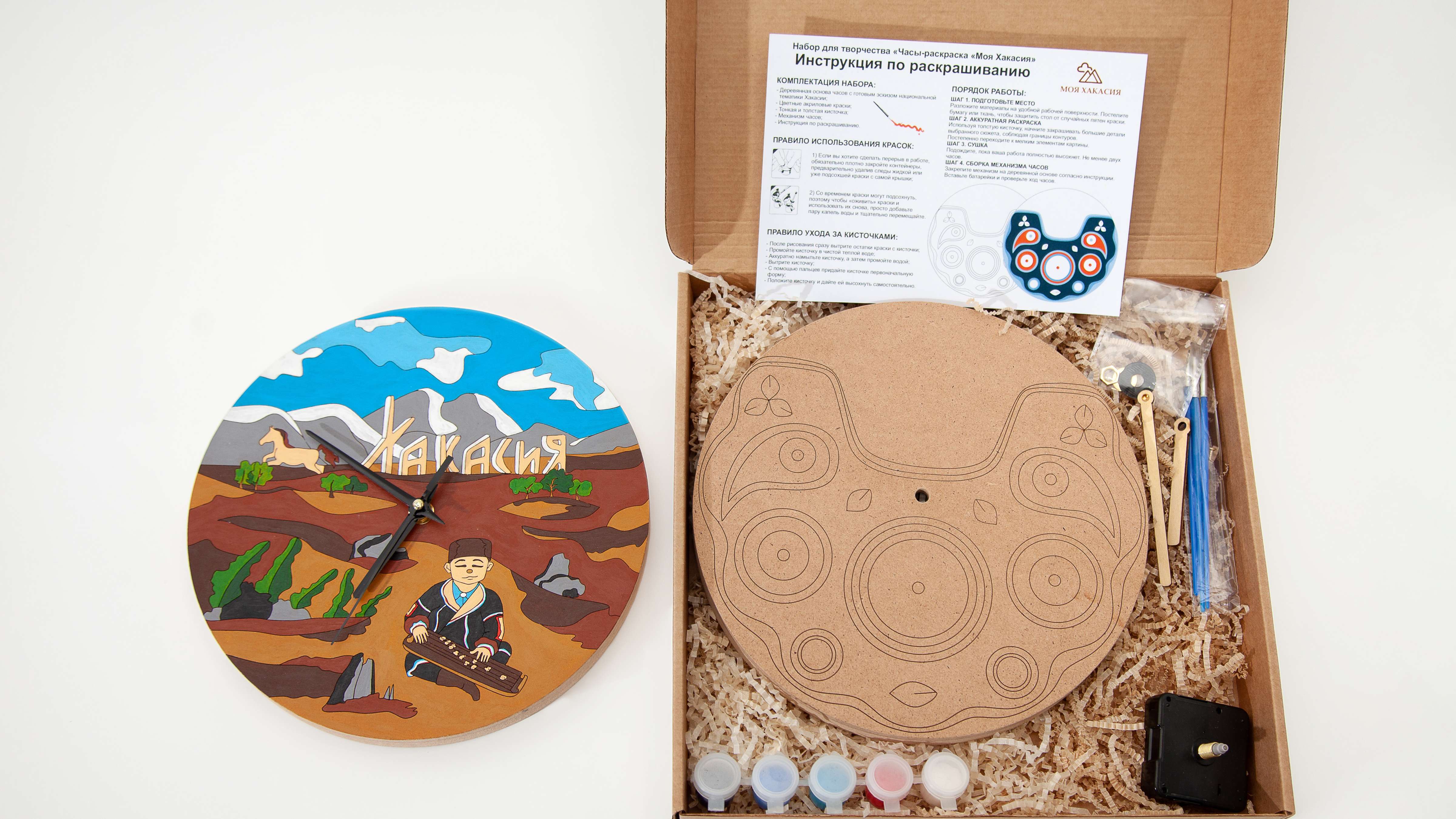 Набор включает деревянную заготовку для часов с выгравированными мотивами Хакасии (пейзаж Хакасии, пого и др.), акриловые краски (для раскрашивания), кисти разного размера, часовой механизм с батарейкой со стрелками, инструкцию, упаковку. Продукт сочетает функции сувенира, предмета интерьера и творческого набора, позволяя пользователю самостоятельно раскрасить часы. Новизна проекта заключается в разработке функционального, визуально привлекательного сувенира, с авторским художественным решением